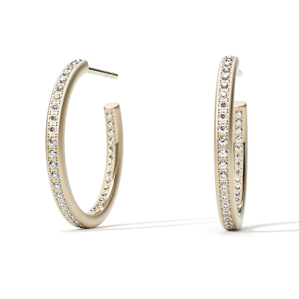 The delicate, classic Niessing Satellite Creole is set all around with diamonds – almost revolutionary in their close proximity, thanks to Niessing's own setting technique. The round creole can be set either only on the outside or also on the inside: In this way, even more fine diamonds catch and reflect the light. Discover ear jewelry that is as precious as it is discreet and that adds a fascinating radiance to your face.